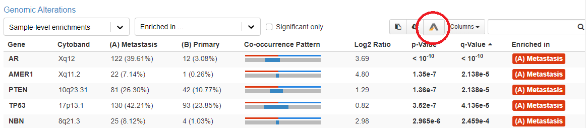 | With AVM for cBioPortal installed, launch directly from a cBioPortal data table to see your data in AVM.